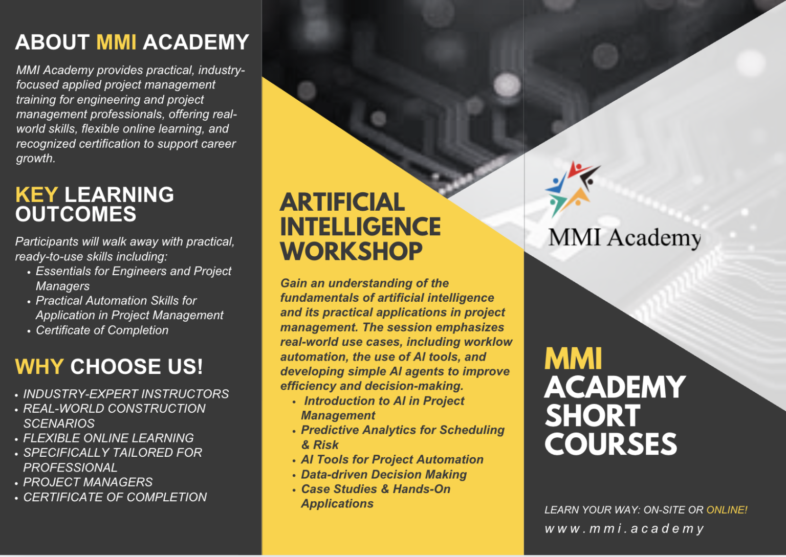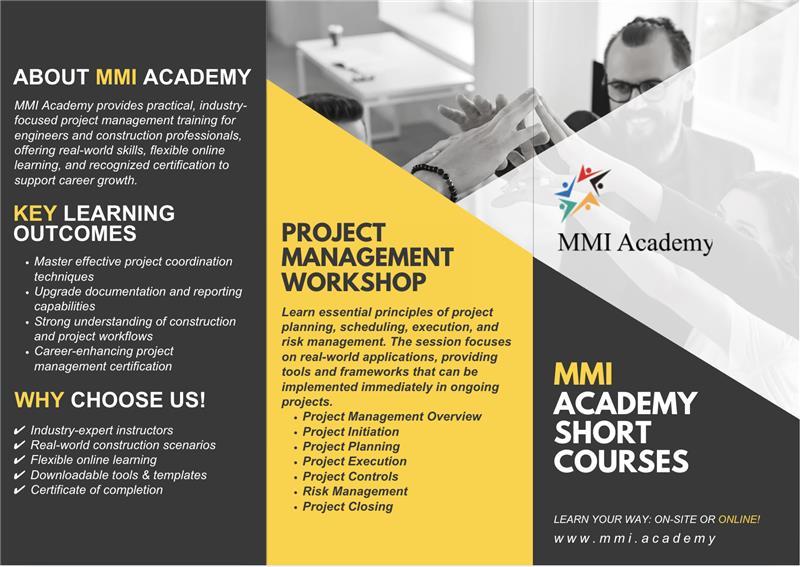 Welcome to MMI Academy, where we delve into the dynamic realm of Applied Project Management. Beyond conventional methodologies, we emphasize the real-world application of project management principles, ensuring our learners gain a comprehensive understanding of how to navigate the complexities of diverse projects effectively. While this course is for anyone, it is highly recommended for those in the engineering and construction industries who would like to transition into a project management role.